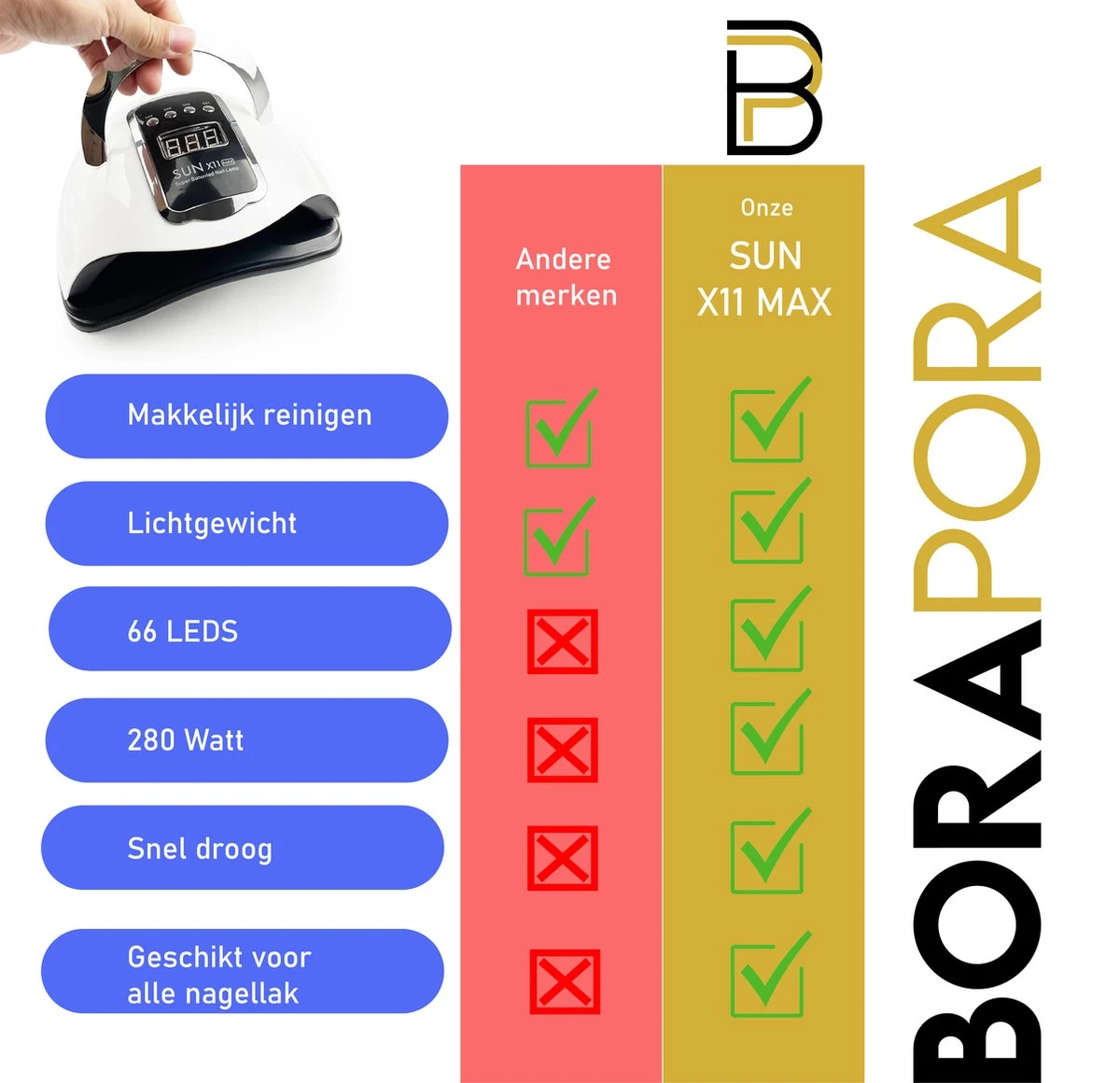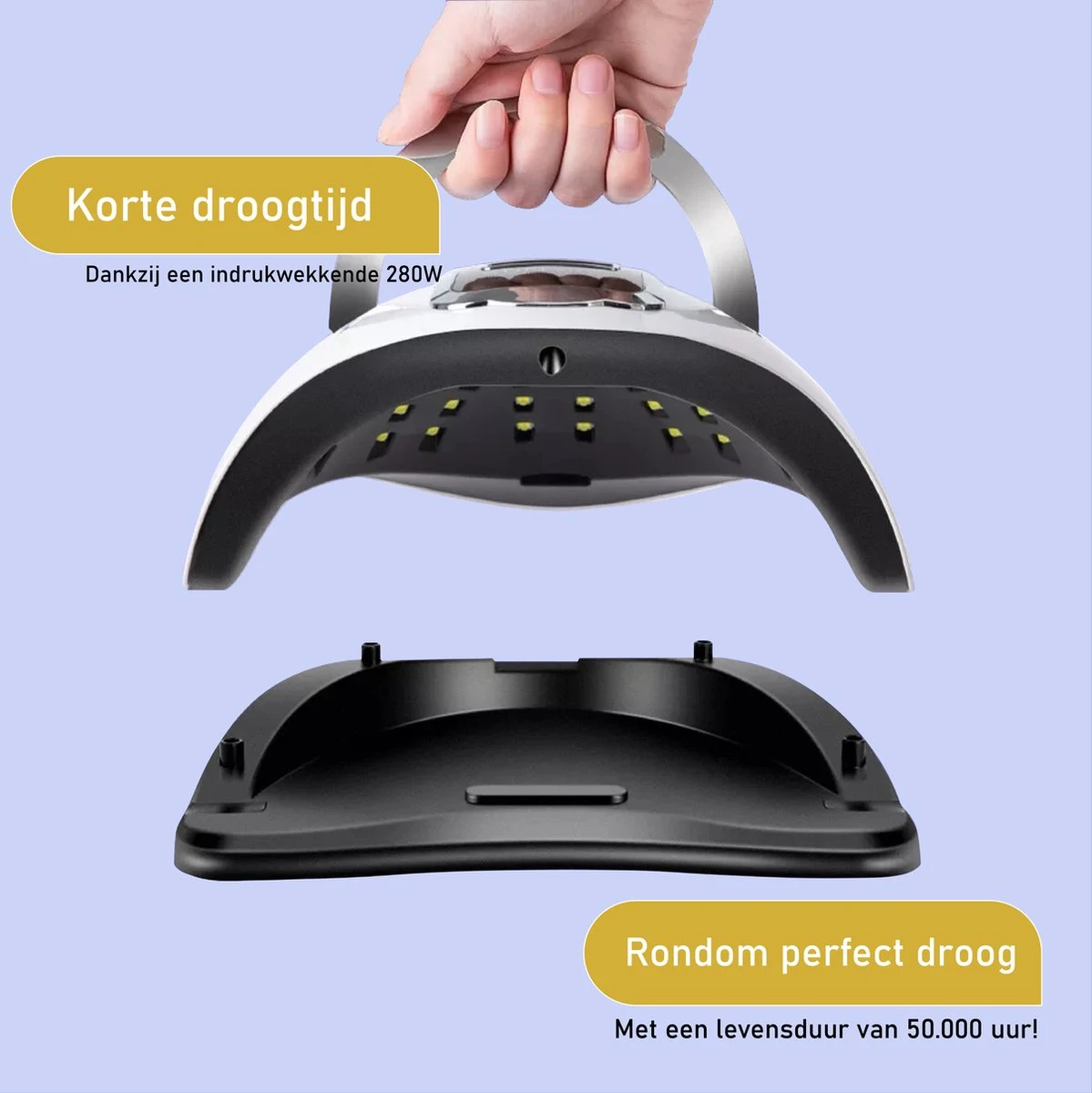 Met de SUN X10 MAX van BoraPora kunt u eenvoudig, snel en zeer efficiënt uw nagels laten drogen. U behaalt een professioneel resultaat zoals u in de salon zou verwachten, maar dan thuis! Ook geschikt voor professioneel gebruik dus! Dit is mogelijk dankzij de 66 LEDS van de 280 Watt UV LED lamp. Ook is de opening zowel geschikt voor uw hele hand (inclusief duim) als uw voet!