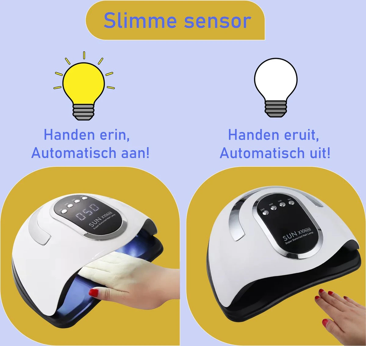 Wanneer u uw hand onder de UV-lamp legt zal deze automatisch aan gaan. Haal uw hand onder de UV-lamp vandaan en de lamp zal weer automatisch uitgaan. Hoe makkelijk!