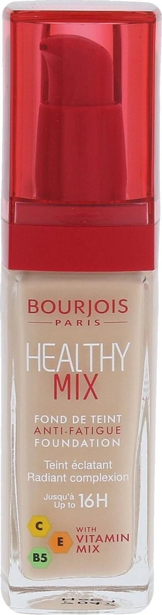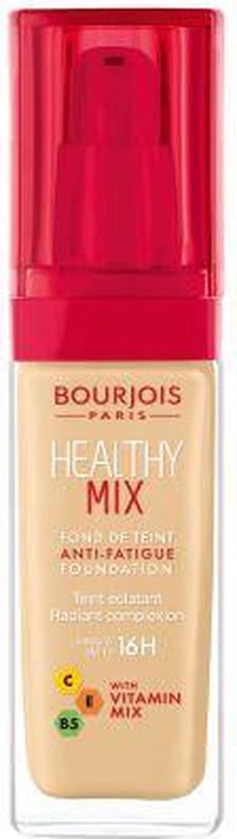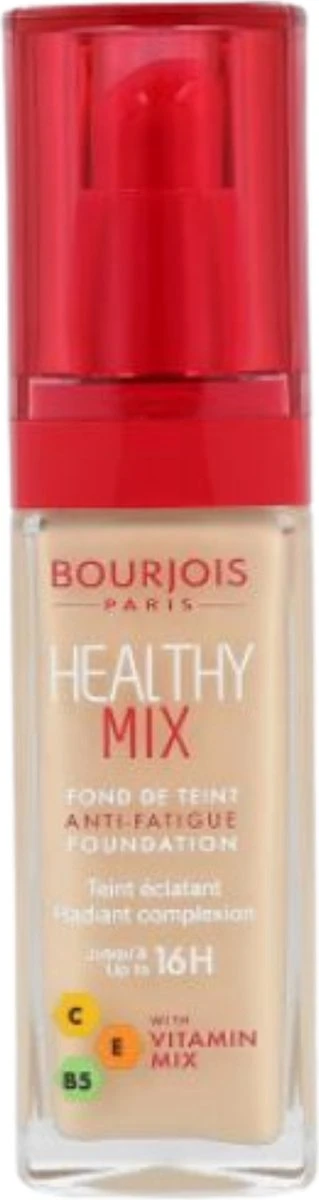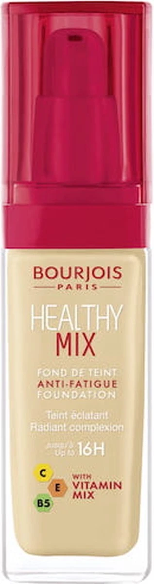 Ben je het zat om er vermoeid uit te zien? De Bourjois Healthy Mix Anti-Fatigue Foundation geeft je een gezonde, natuurlijke glans die jouw huid weer laat stralen. Met de mix van vitamine C, E en B5 verbergt het direct onvolkomenheden en tekenen van vermoeidheid en versterkt het de glans van de huid voor een fris uitziende blik. Je huid is 16 uur lang 70% stralender en blijft tot 24 uur gehydrateerd. De smeltende textuur met hyaluronzuur mengt perfect met de huid en blijft de hele dag comfortabel aanvoelen. Voor een medium dekking en semi-matte afwerking direct na het aanbrengen. Healthy Mix Anti-Fatigue make up foundation van Bourjois is je nieuwe geheime wapen om er altijd fris en stralend uit te zien! Als Parijs merk is Bourjois geïnspireerd door de “je ne sais quoi” waarvoor de Parisiennes zo bekend om staan. Speel met kleur en voeg wat speelsheid toe aan je stijl. Wij schenken elke vrouw het Parijse geheim van moeiteloze maar chique schoonheid.